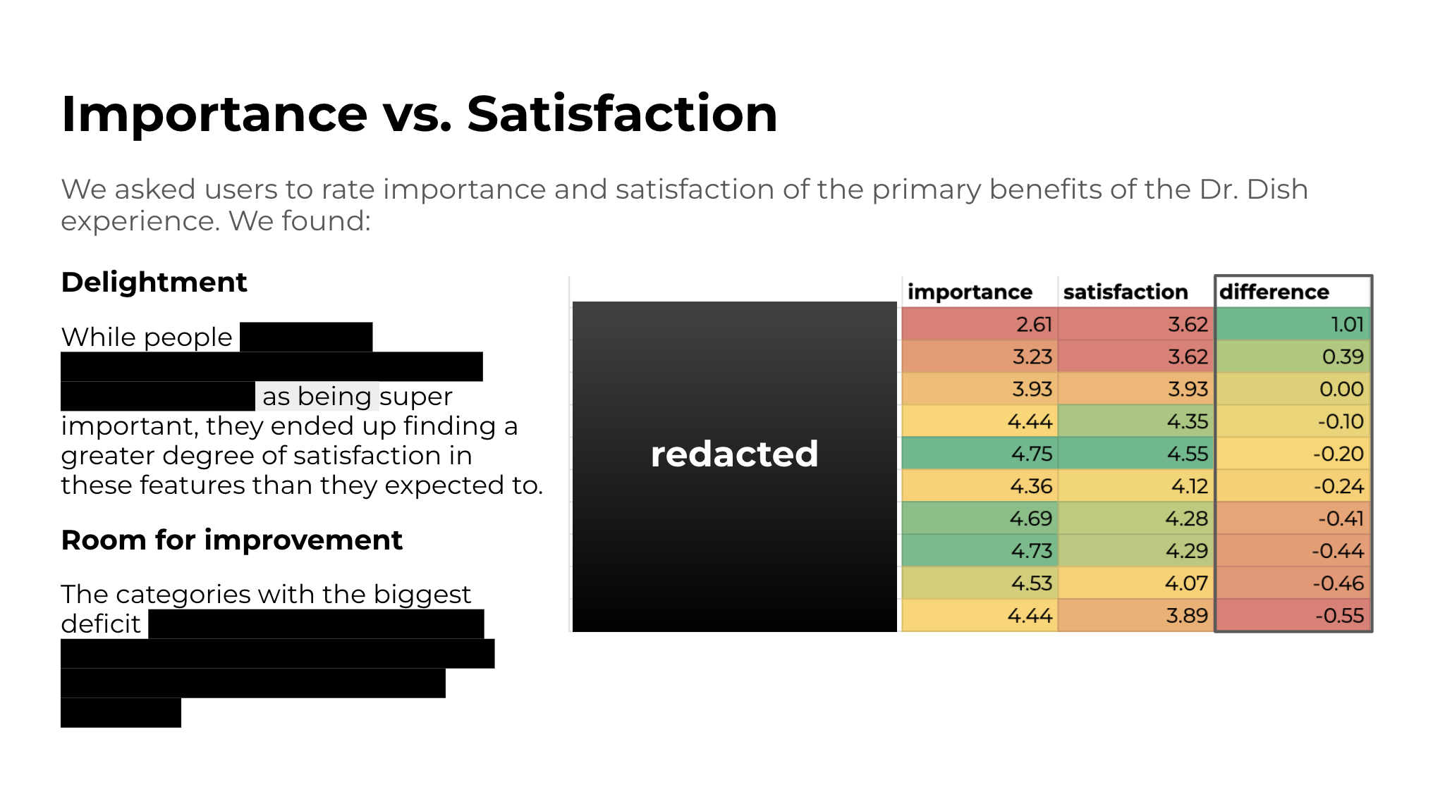*redacted to protect company data*; You can see how I was able to make it clear which features were the most important to users and which features provided the greatest level of satisfaction. When features were not particularly important but satisfied customers, we considered them delighters. When features were important but did not satisfy customers, those were areas for improvement.