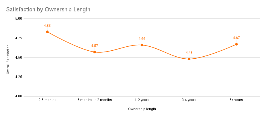 *example data used*, however, it is very typical for user satisfaction to drop over the course of ownership length due to the novelty of a new purchase wearing off.