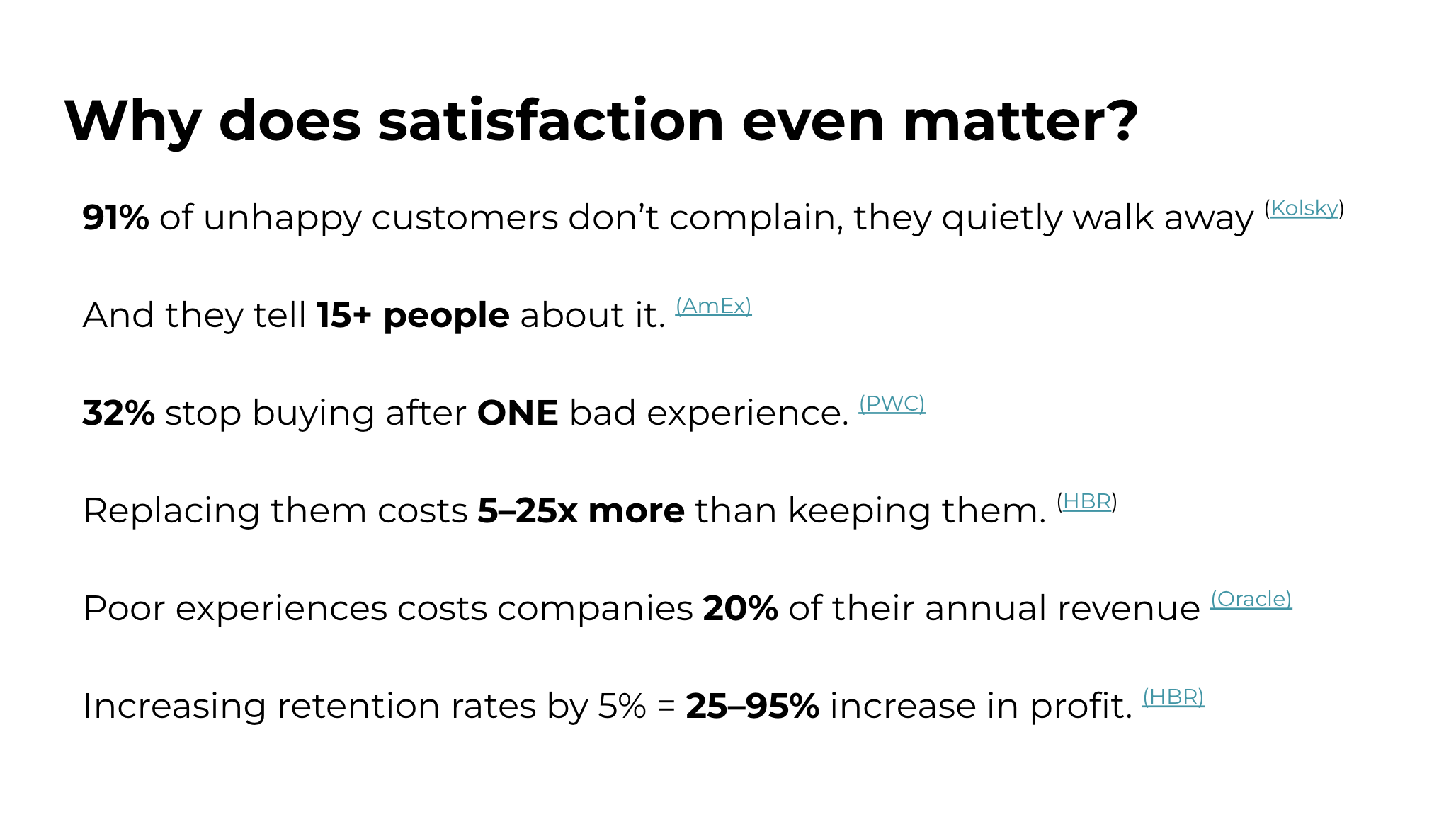 This mattered because satisfaction isn’t a “nice to have.” When customers see value in what they bought, they become advocates. They renew, they recommend, and they make your product gain traction in ways a company couldn’t without their support. Without a reliable way to measure satisfaction, we were flying blind and risking time, energy, and roadmap bets on the things that might not move the needle.